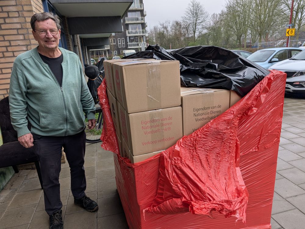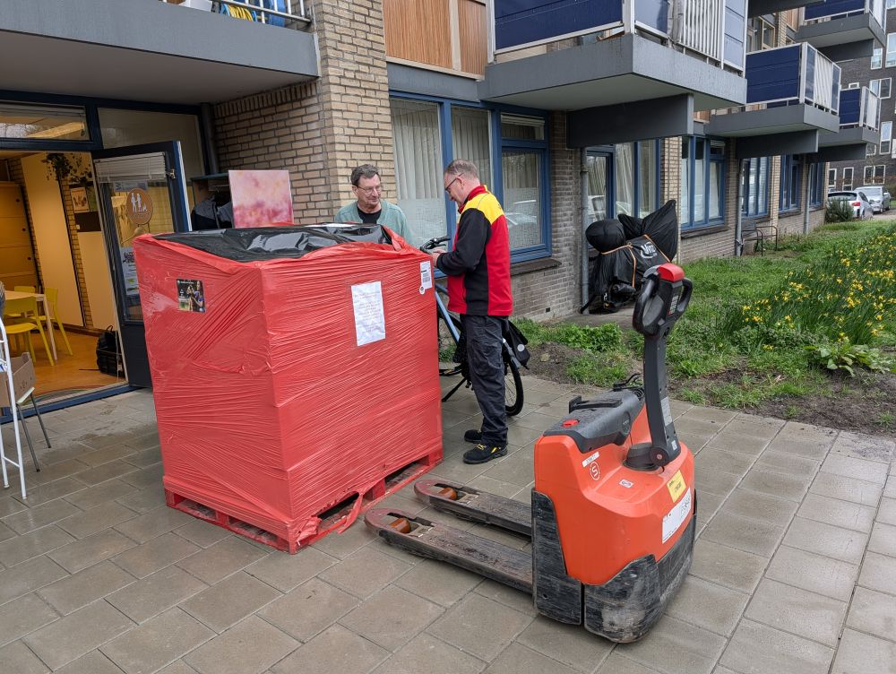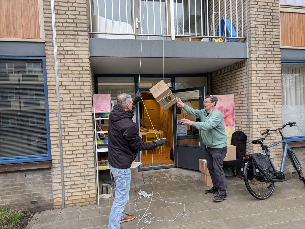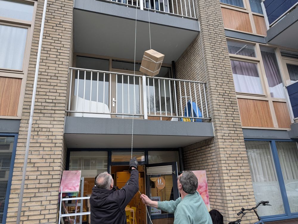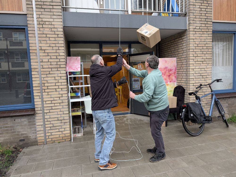 De dierenvoedselbank "Kabbel en Babbel" heeft er een nieuwe gadget bij: een heuse "touw en blok" hijsinstallatie! Elke maand ontvangt de dierenvoedselbank een pallet pakketjes diervoedsel. De ruimtes zijn erg beperkt in omvang en verdeeld over twee verdiepingen. Om alle pakketjes op te slaan moeten er een aantal naar de tweede verdieping van het gebouw. Dit betekent een forse workout voor de vrijwilligers; je sjouwt een pakket van ca 15kg de trappen op, maar ook steeds je eigen lichaamsgewicht! Na zo'n ontvangst van pakketten en vele malen de twee trappen op en af gelopen te hebben, waren de vrijwilligers zo ongeveer "kapot".