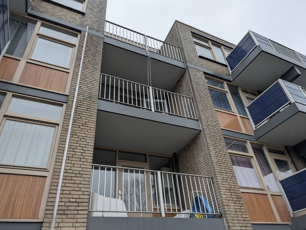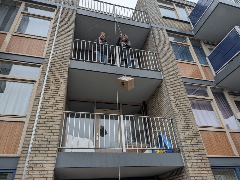 Er werd op internet, met subsidie van het wijknetwerk, een touw en blok; nou ja meer een "touwtje en blokje" samengeraapt, ...en hijsen maar! | ![]() |